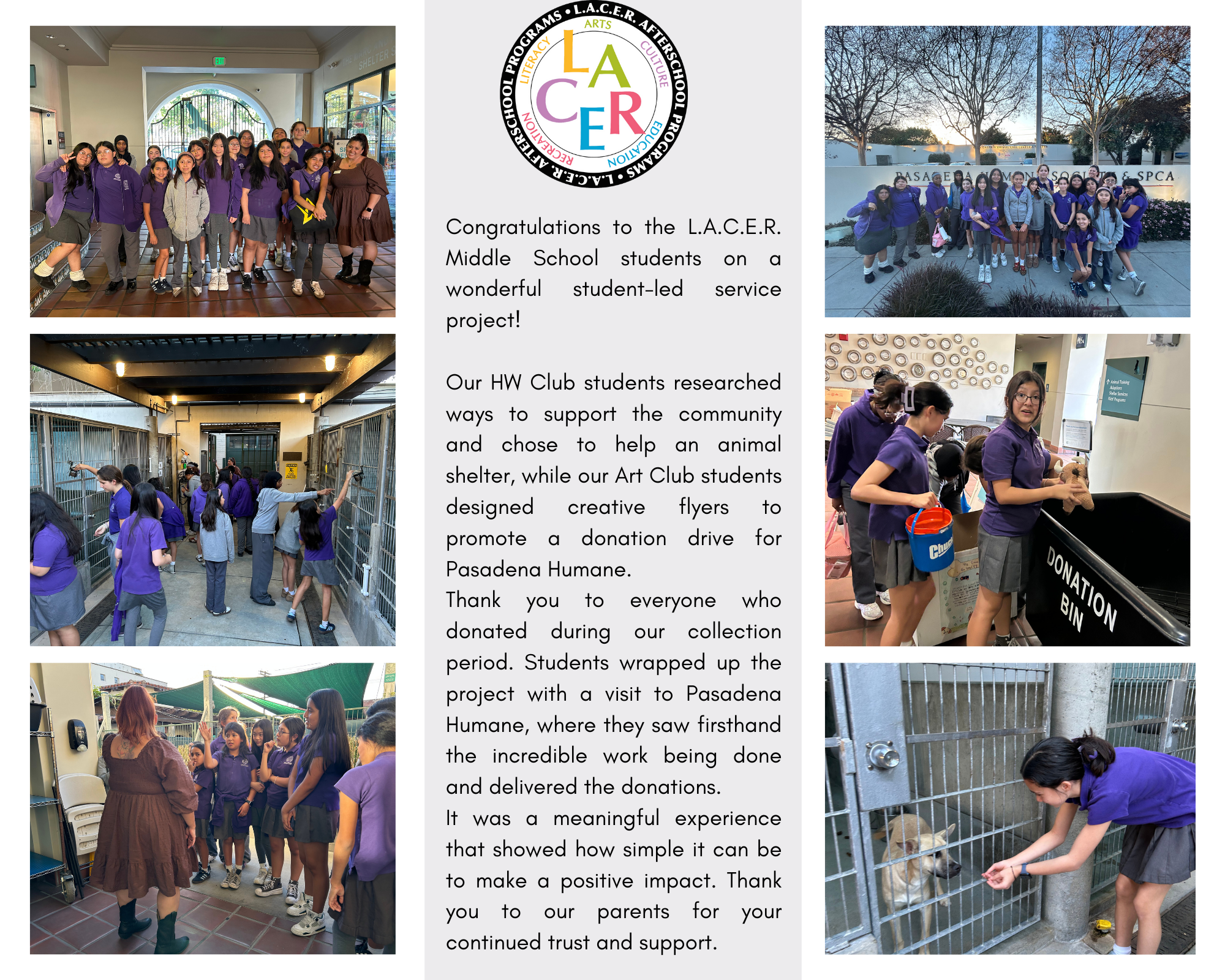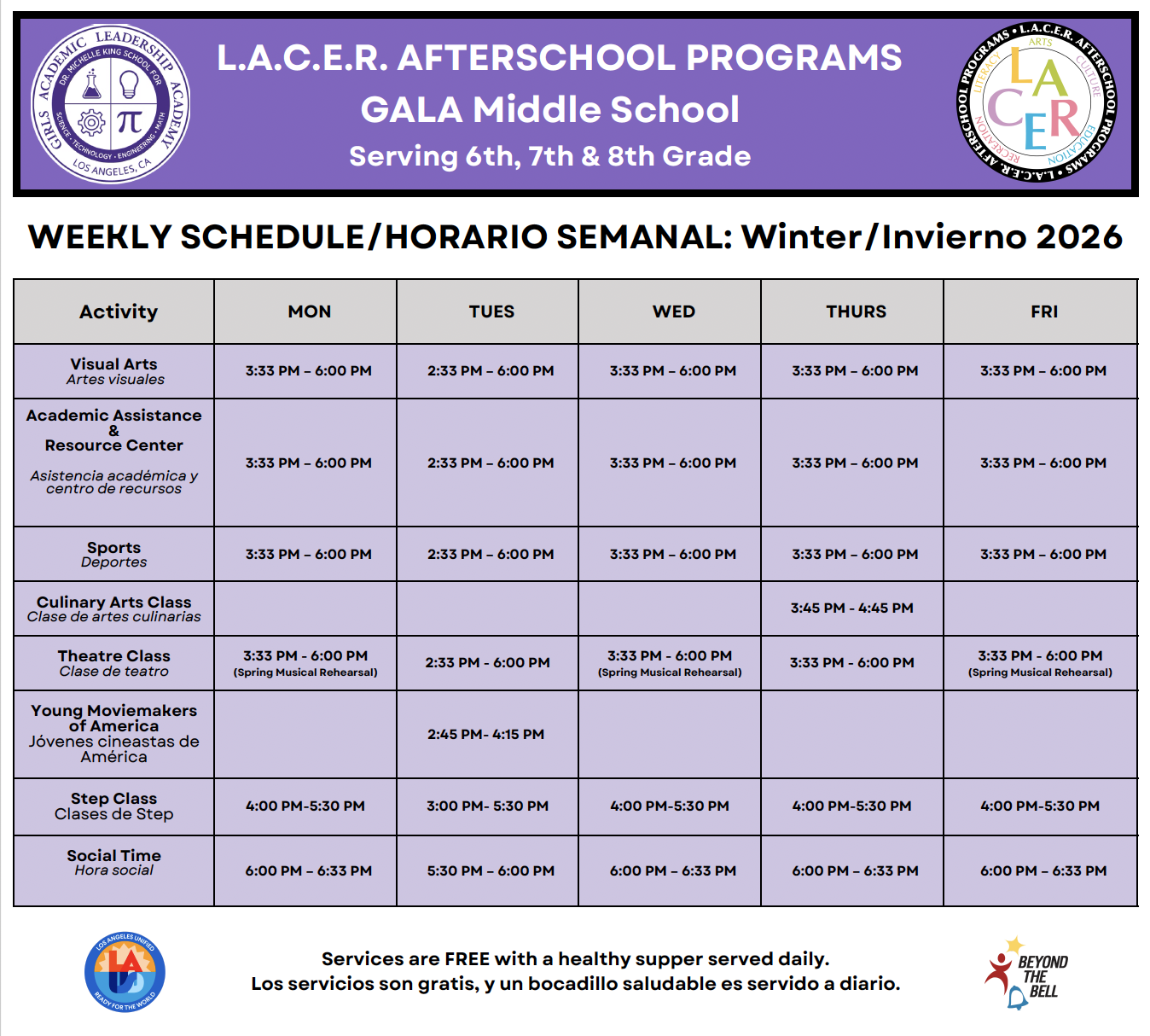 The L.A.C.E.R. Afterschool Programs provide free classes in the arts, athletics, and academics every day, after school, to almost 1,000 students a day, grades 6th-12th. L.A.C.E.R. is creating opportunities, building academic skills, and preparing students for their future.