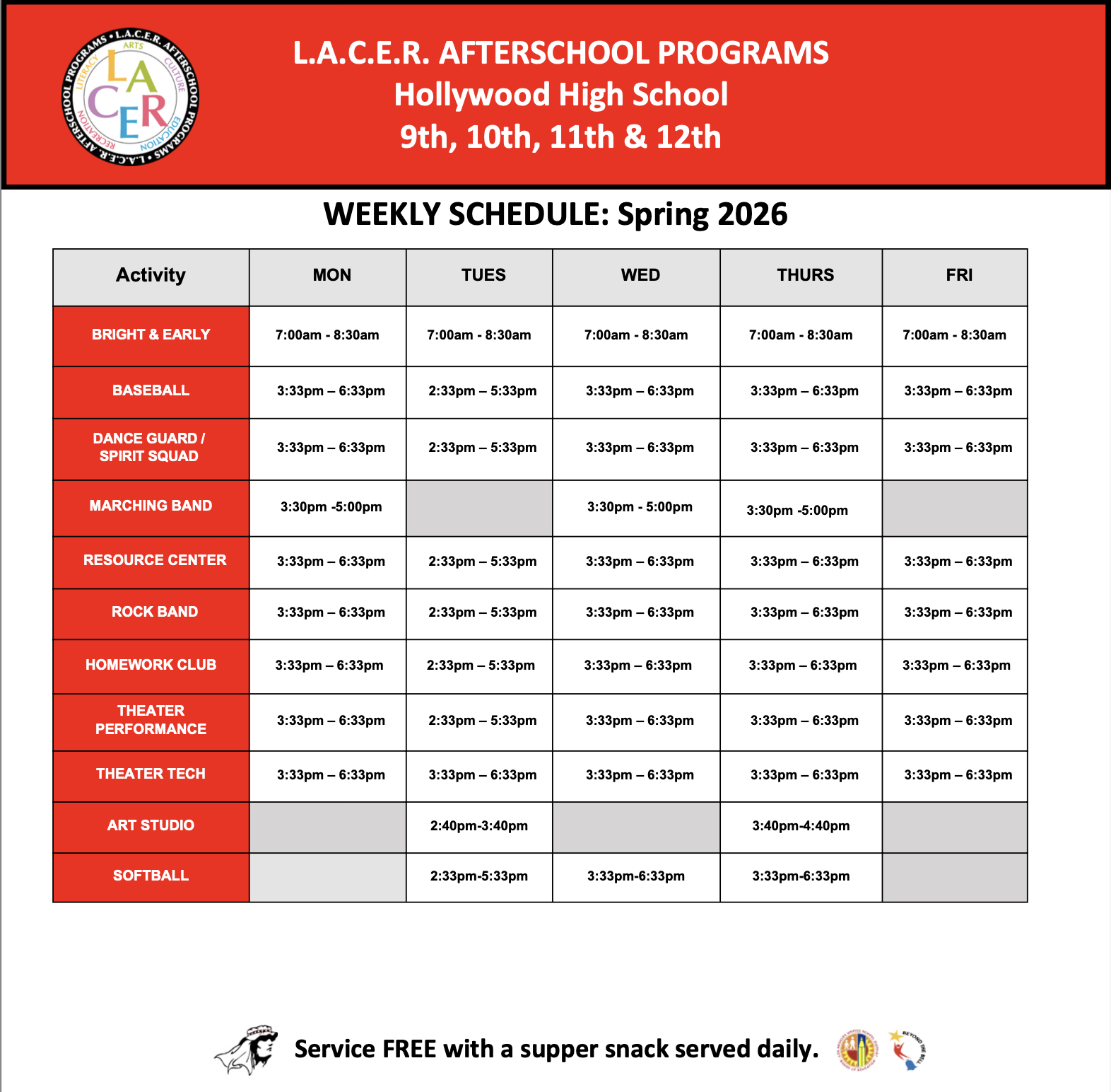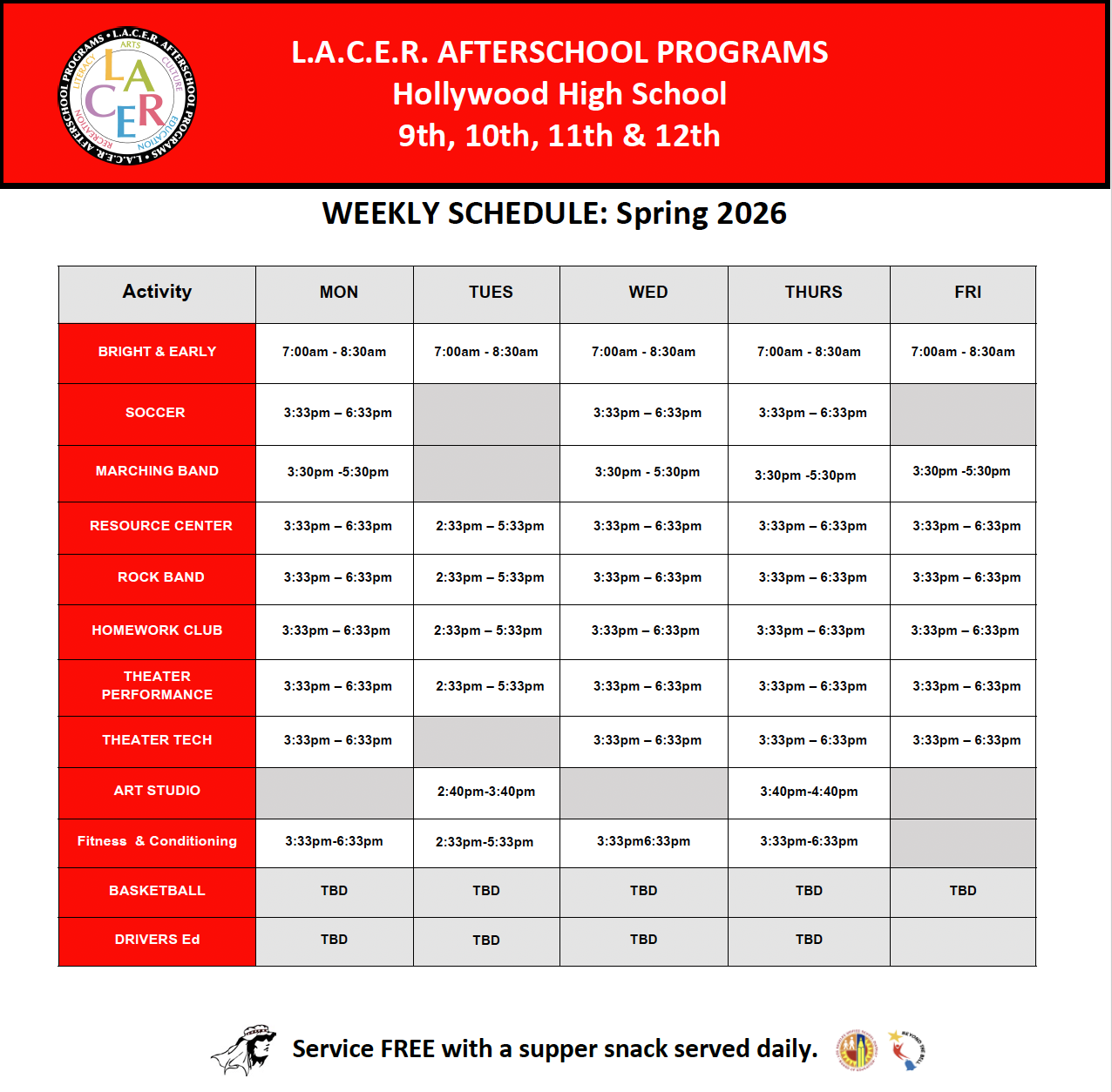 The L.A.C.E.R. Afterschool Programs provide free classes in the arts, athletics, and academics every day, after school, to almost 1,000 students a day, grades 6th-12th. L.A.C.E.R. is creating opportunities, building academic skills, and preparing students for their future.