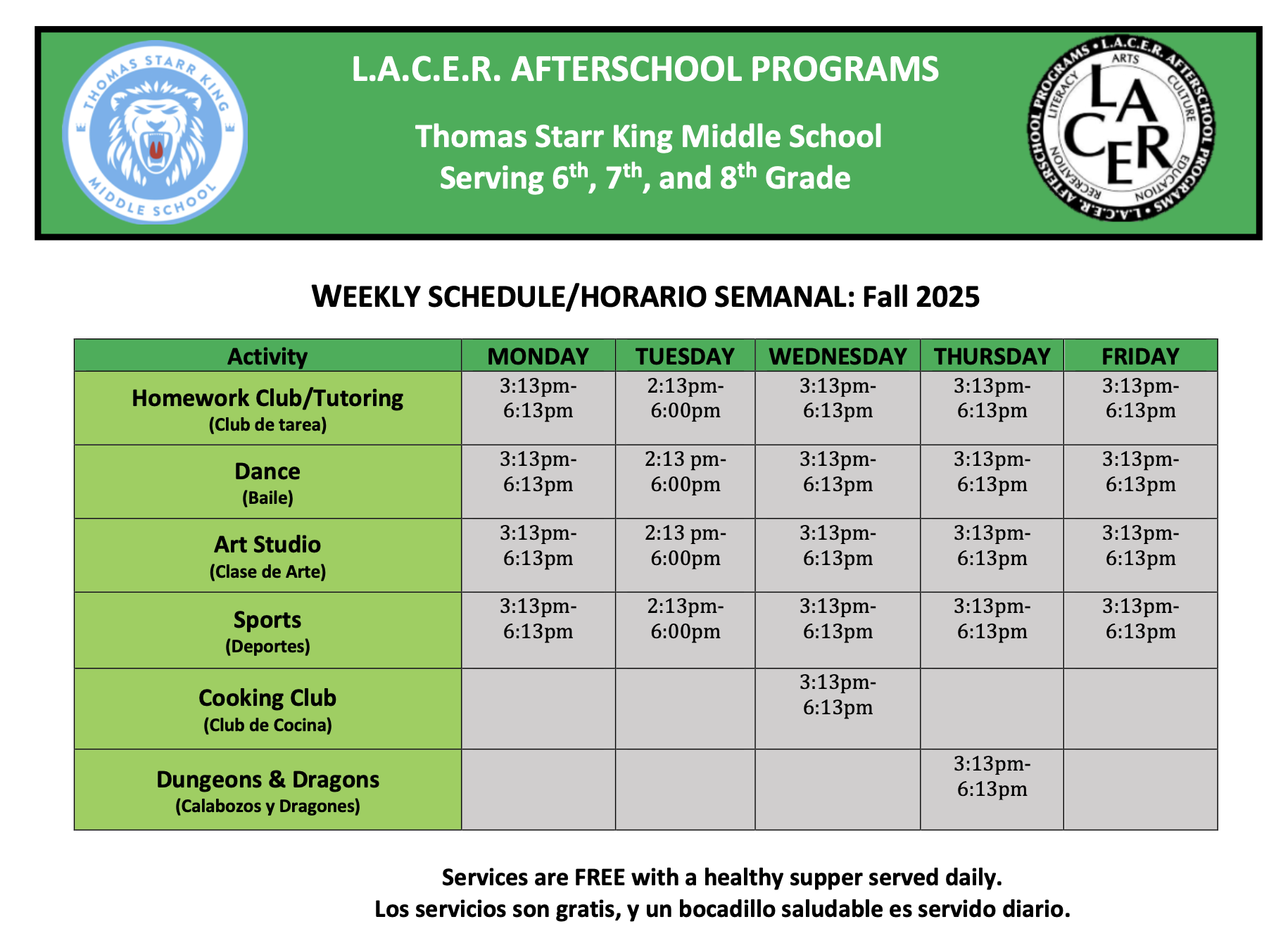 The LACER Afterschool Program at King Middle School is available to all students who attend KMS for free. The program accepts new students by lottery each year.