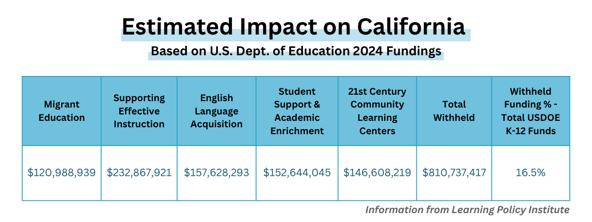 In California, over $800 million in federal funding is being withheld, which represents about 17% of California’s federal education budget. $146 million in 21st Century Community Learning Center funding will be held, which provides the funding for summer programs that started today and is the only dedicated funding stream for high school students in after-school and summer learning programs.